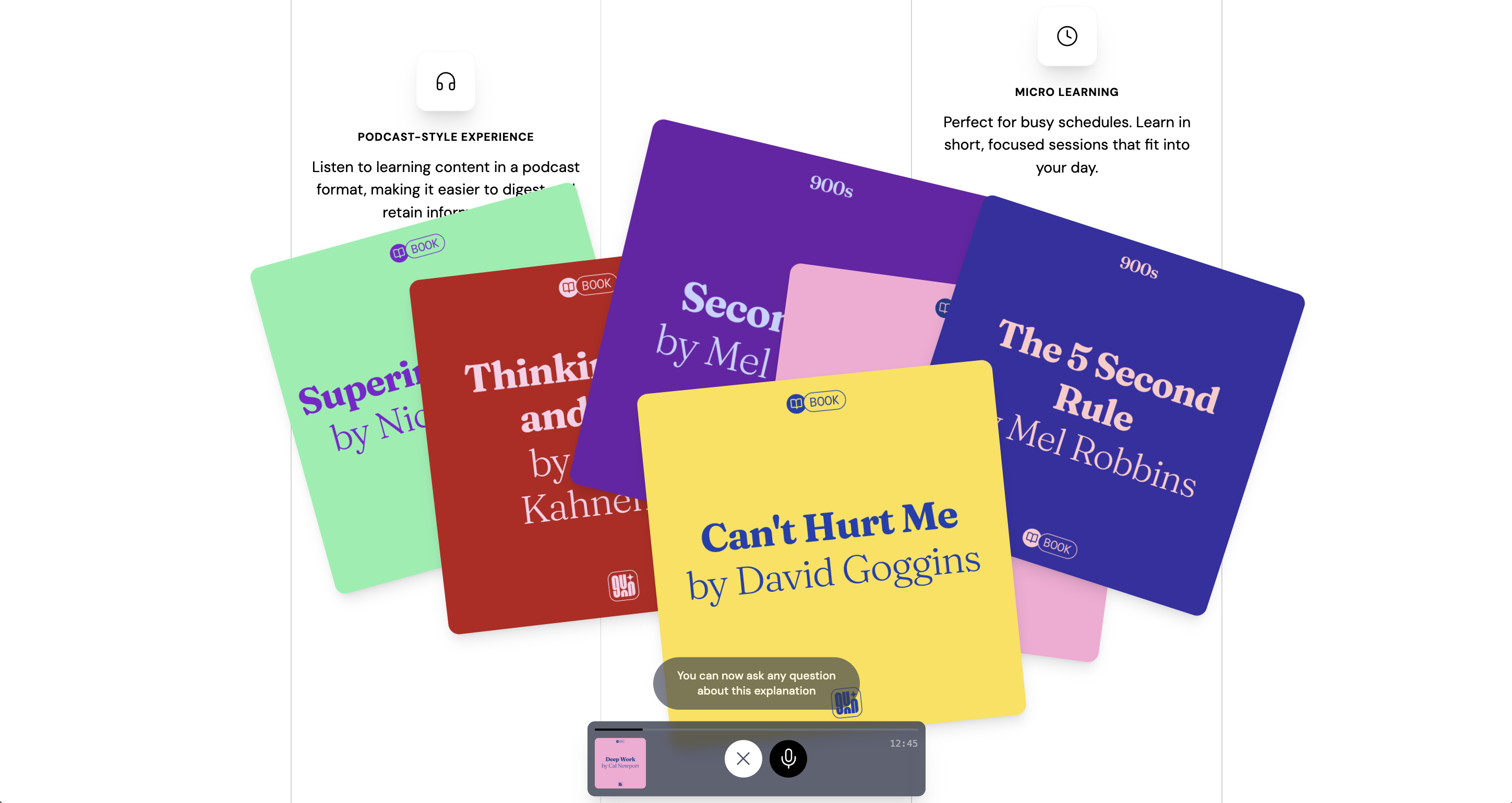 Interactive podcast-style audio player delivering bite-sized 15-minute episodes and live AI conversations for effortless, science-backed learning.