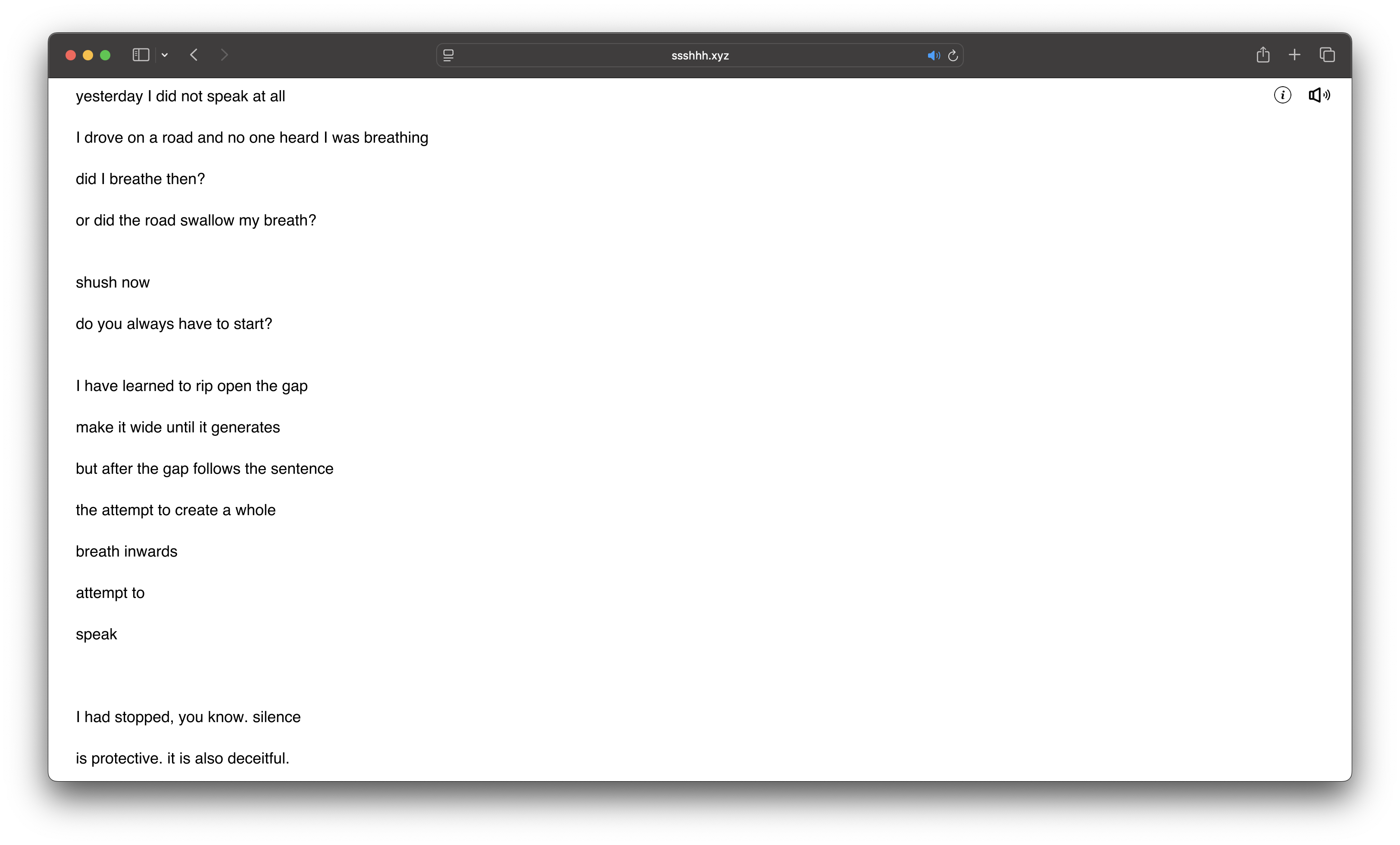 For this commission, I created an intimate soundscape that interprets Raphael Koranda’s Silence digital poem. The composed soundscape exists within the website https://ssshhh.xyz/